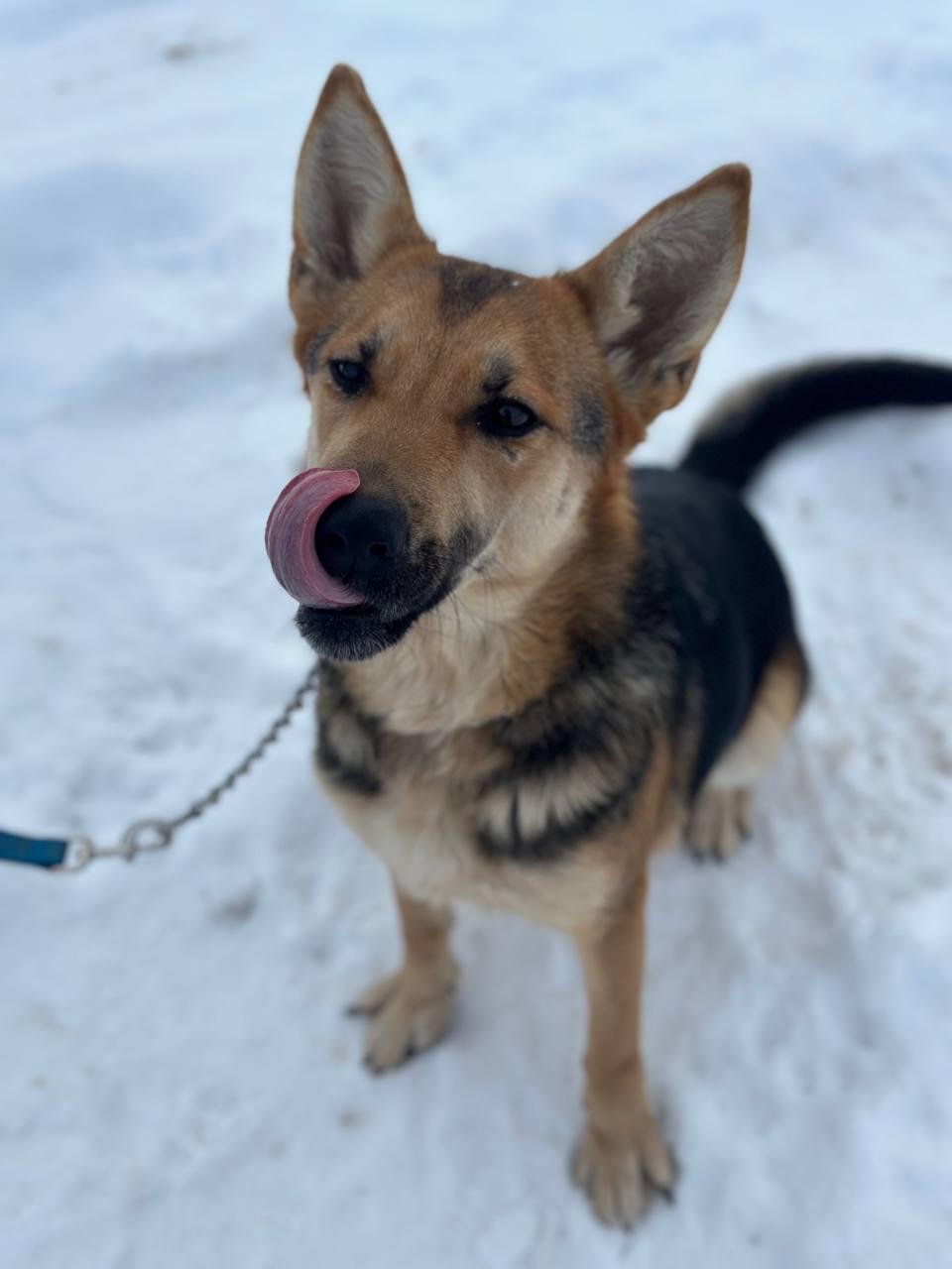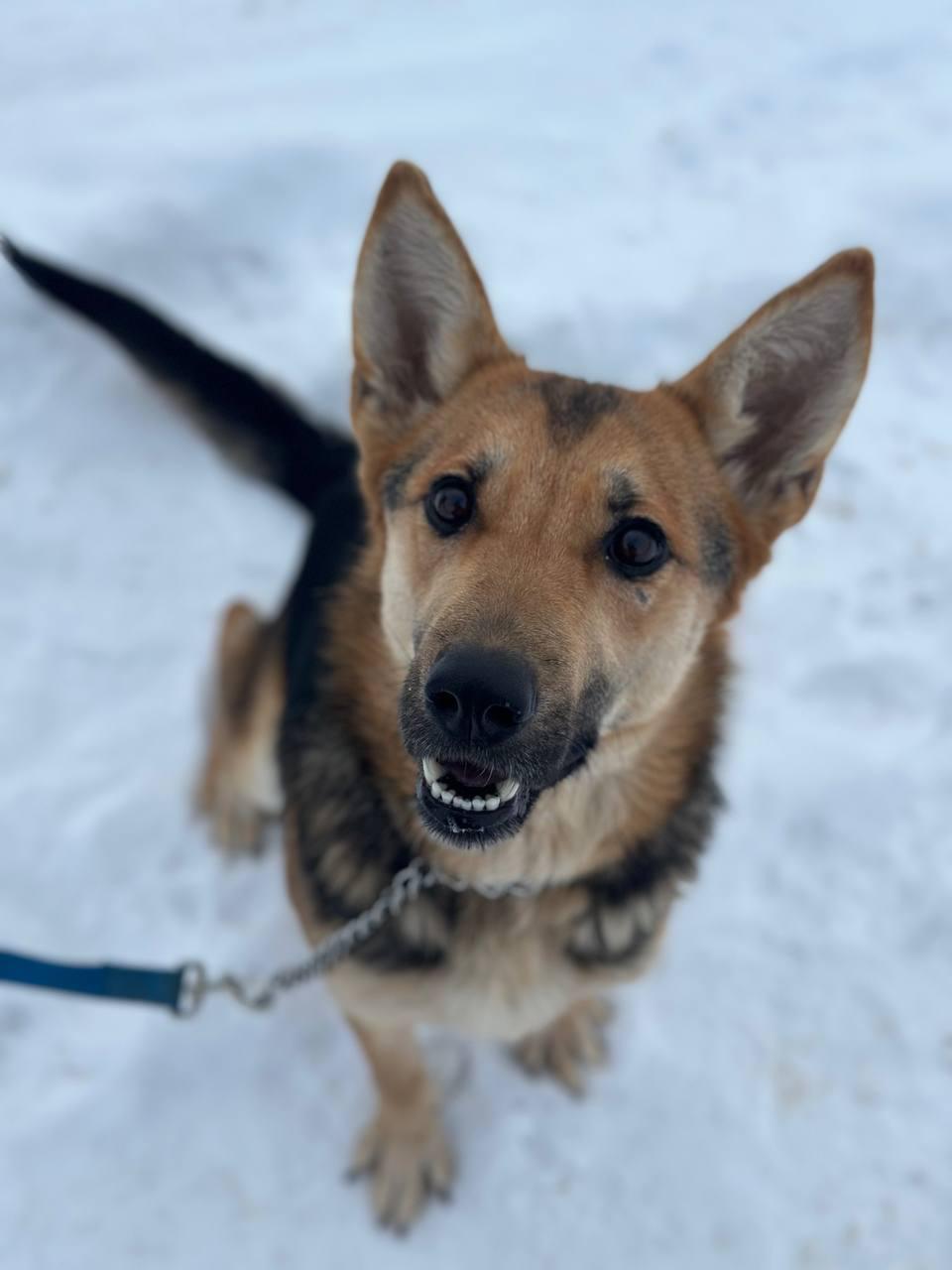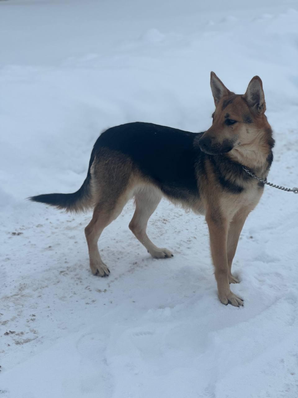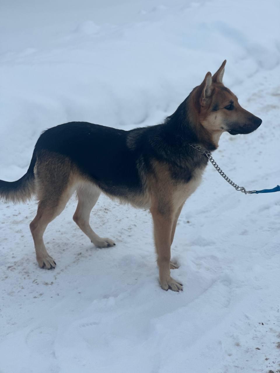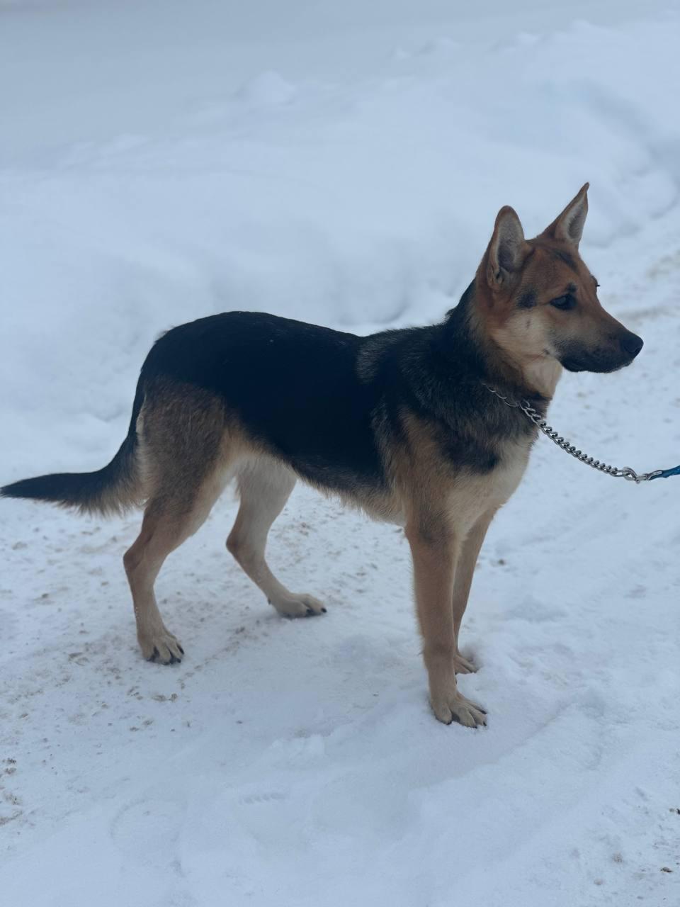 - Внешность: Эта красавица представляет собой помесь овчарки, с характерным чапрачным окрасом. Её возраст мы оцениваем примерно в 2-4 года.